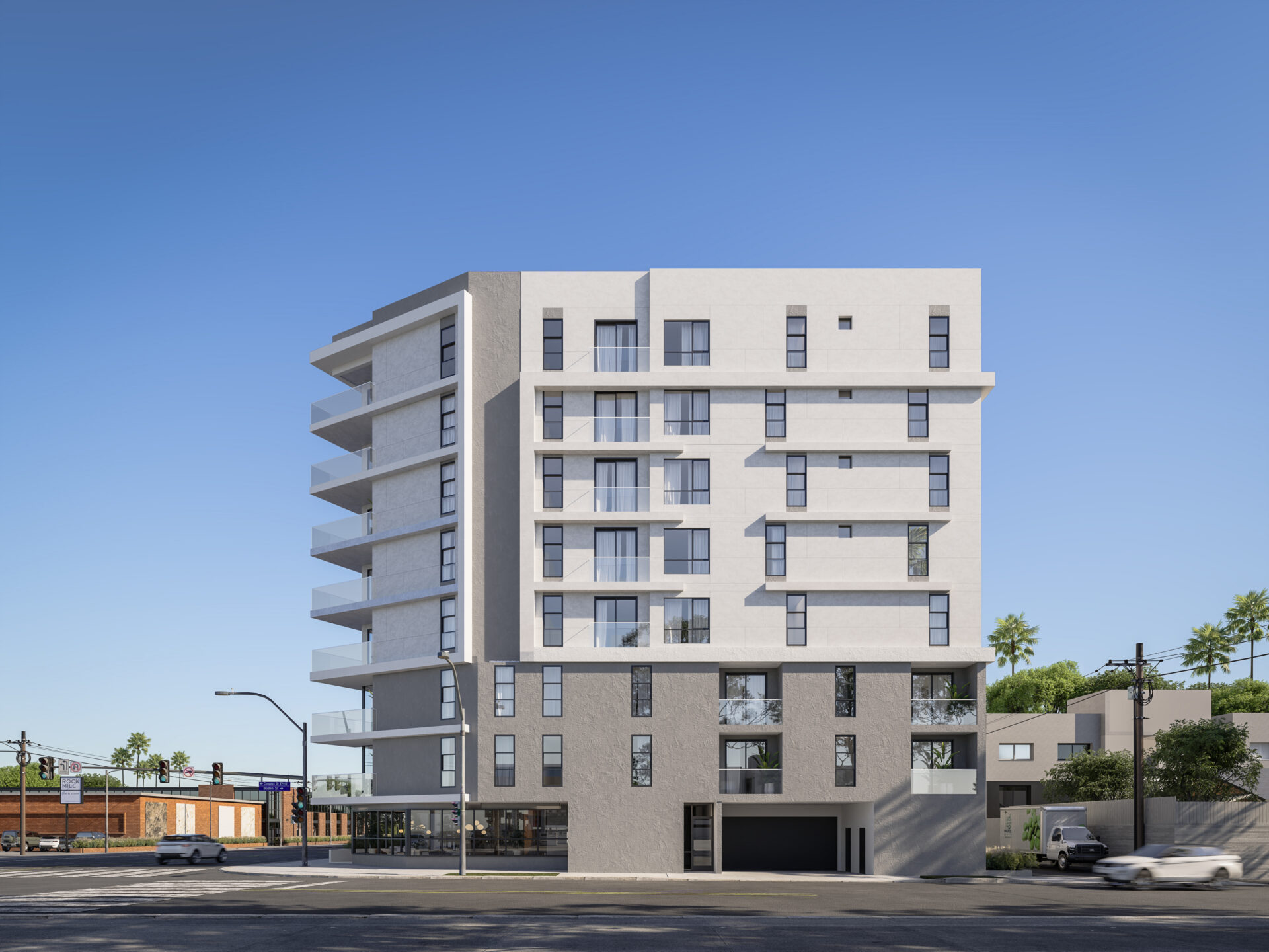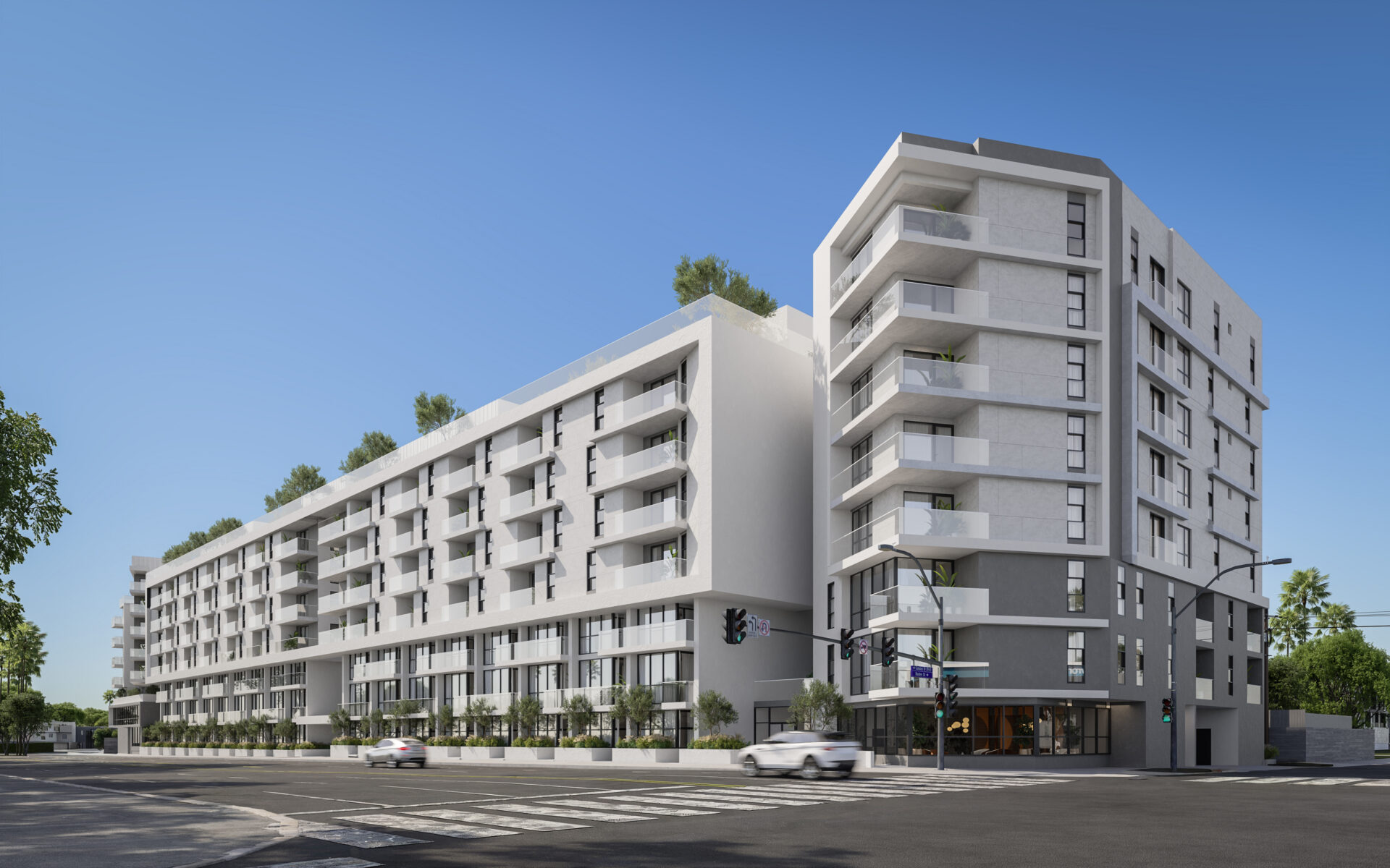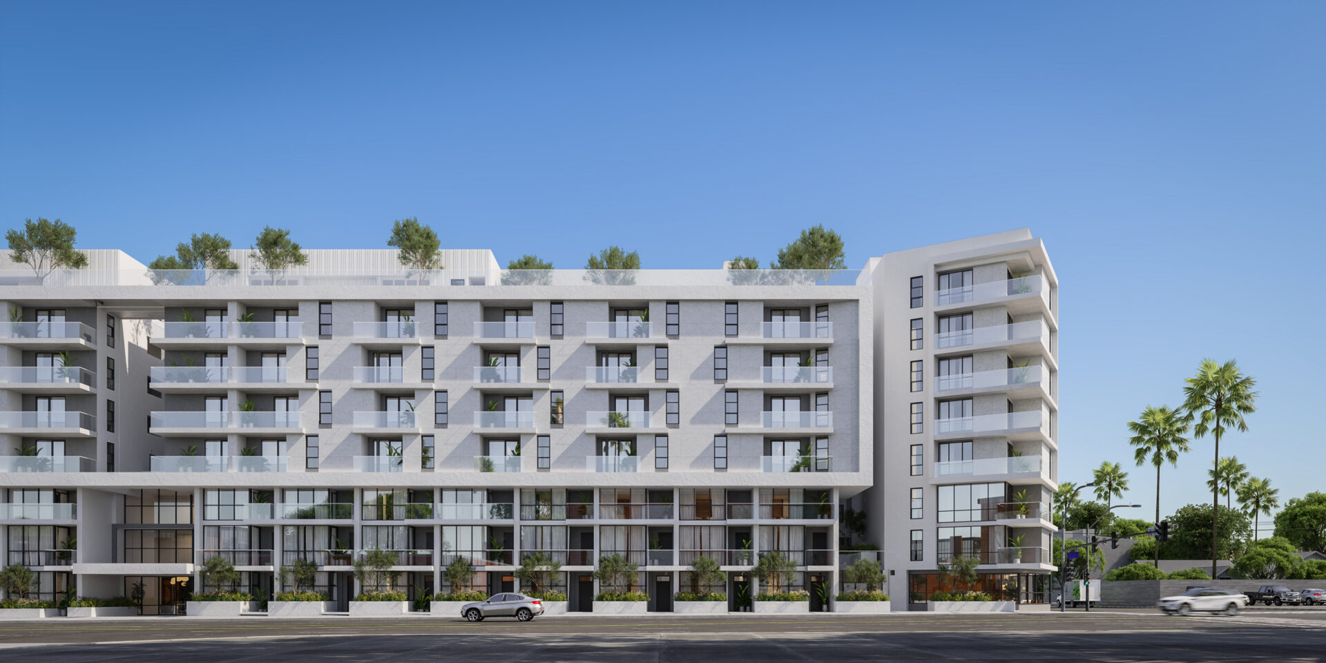Defined by layered volumes, recessed terraces, and a rhythm of glass and shadow within La Cienega brings balance between structure and light within its 302,968 square feet building brings 379 apartment units.