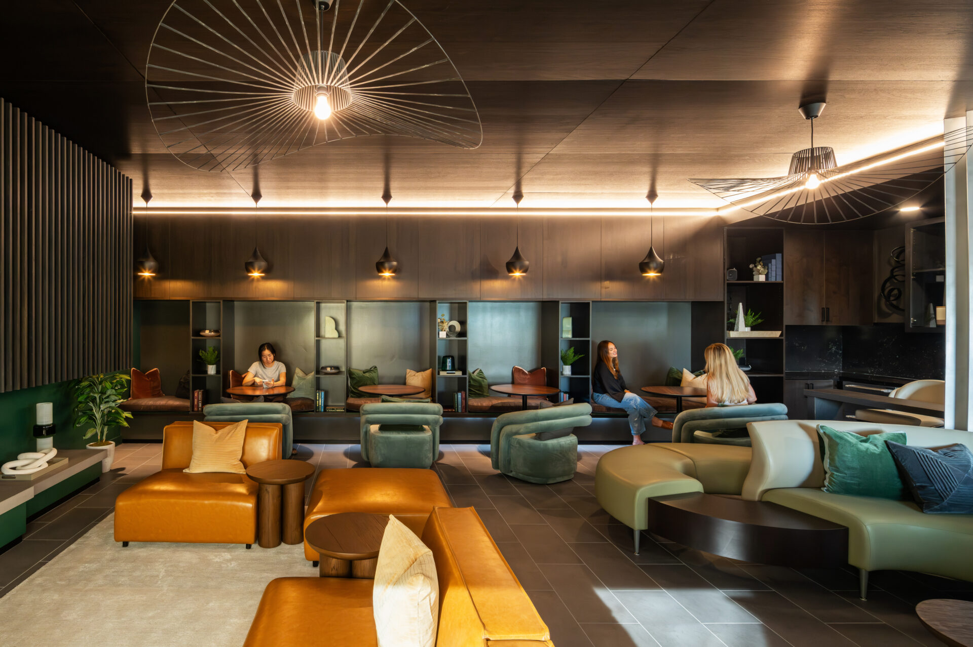 The façade is built with an asymmetrical, wooden slat panel system that reflects the sunlight in different ways at various times throughout the day creating a pattern allowing light into the common open spaces.